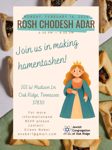 Sisterhood Rosh Chodesh Adar at JCOR (Jewish Congregation of Oak Ridge) Monday, February 16 @ 6:30pm – 8:00pm