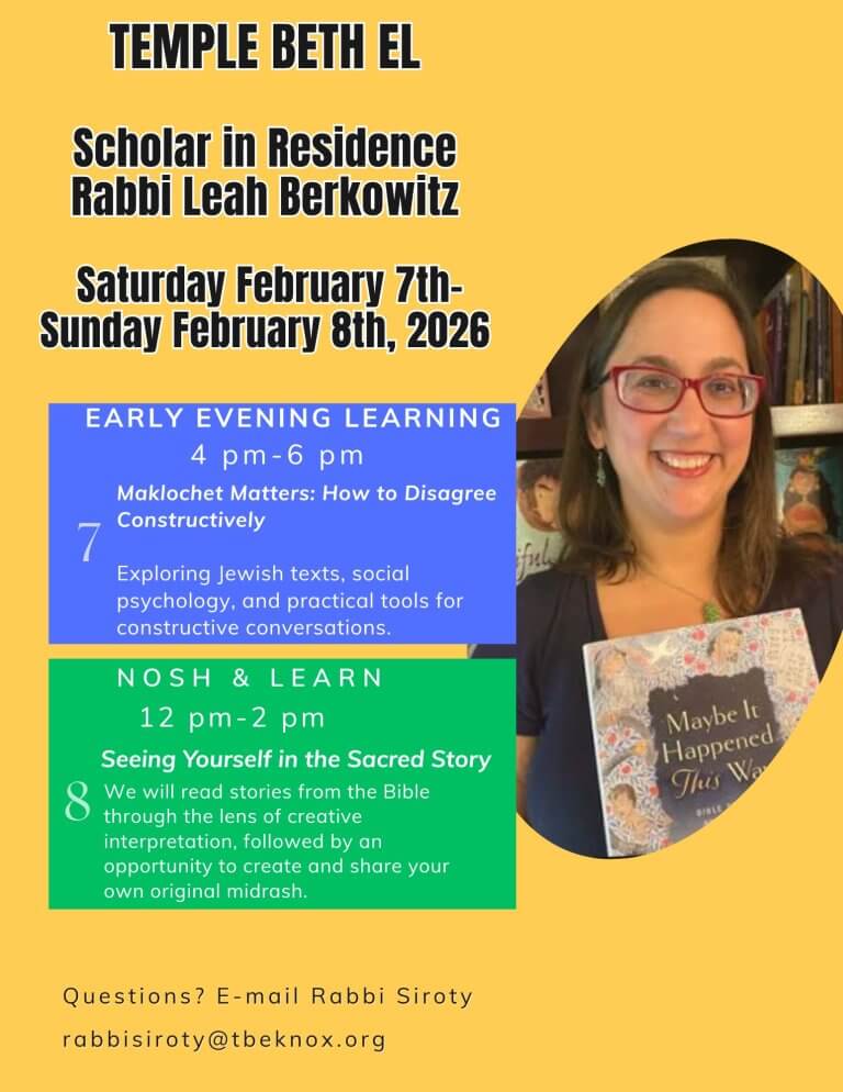 Scholar in Residence Rabbi Leah Berkowitz at Temple Beth El Saturday, February 7 @ 4:00pm – 6:00pm Maklochet Matters: How to Disagree Constructively Sunday, February 8 @ 12:00 noon – 2:00pm Seeing Yourself in the Sacred Story